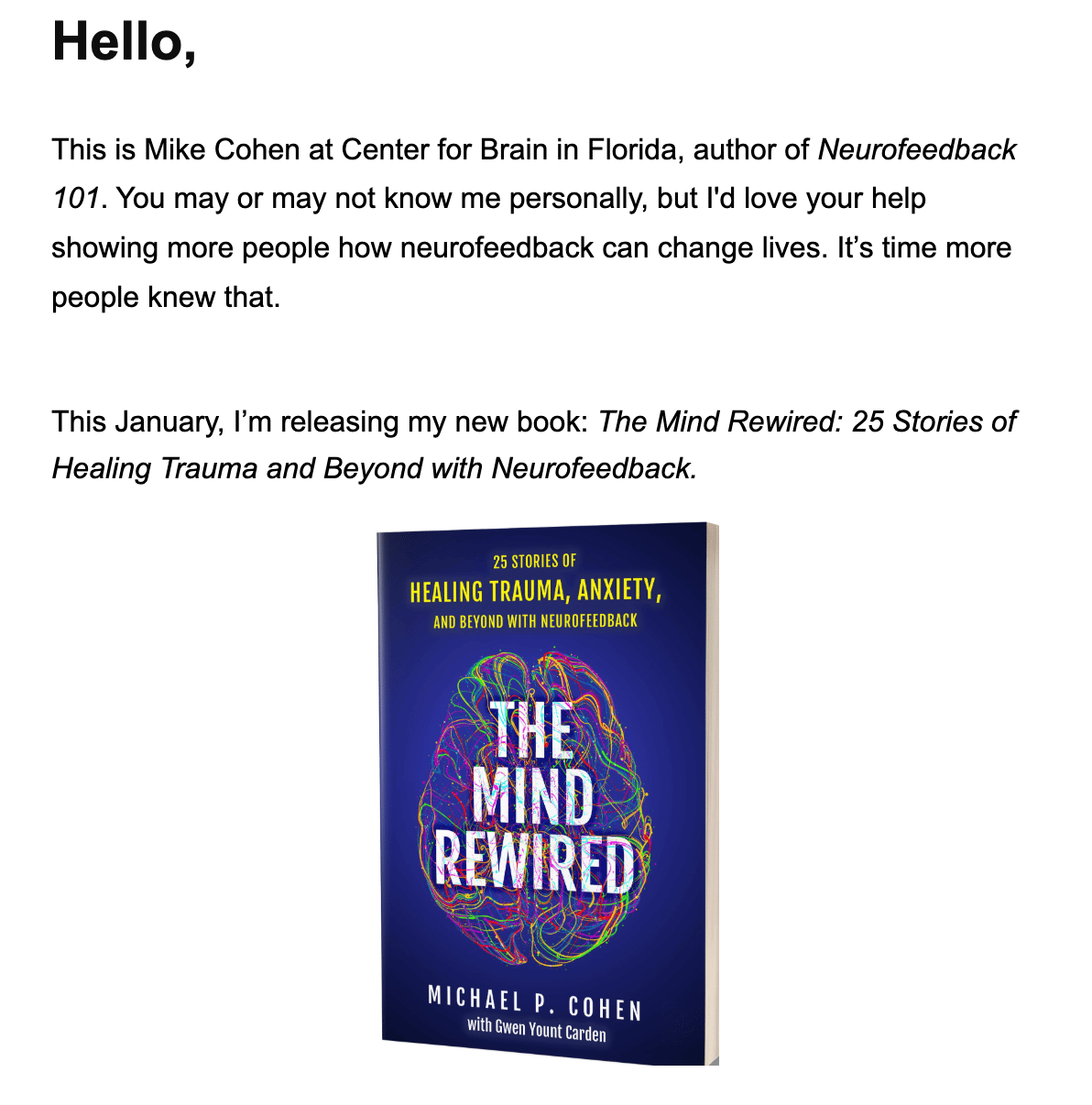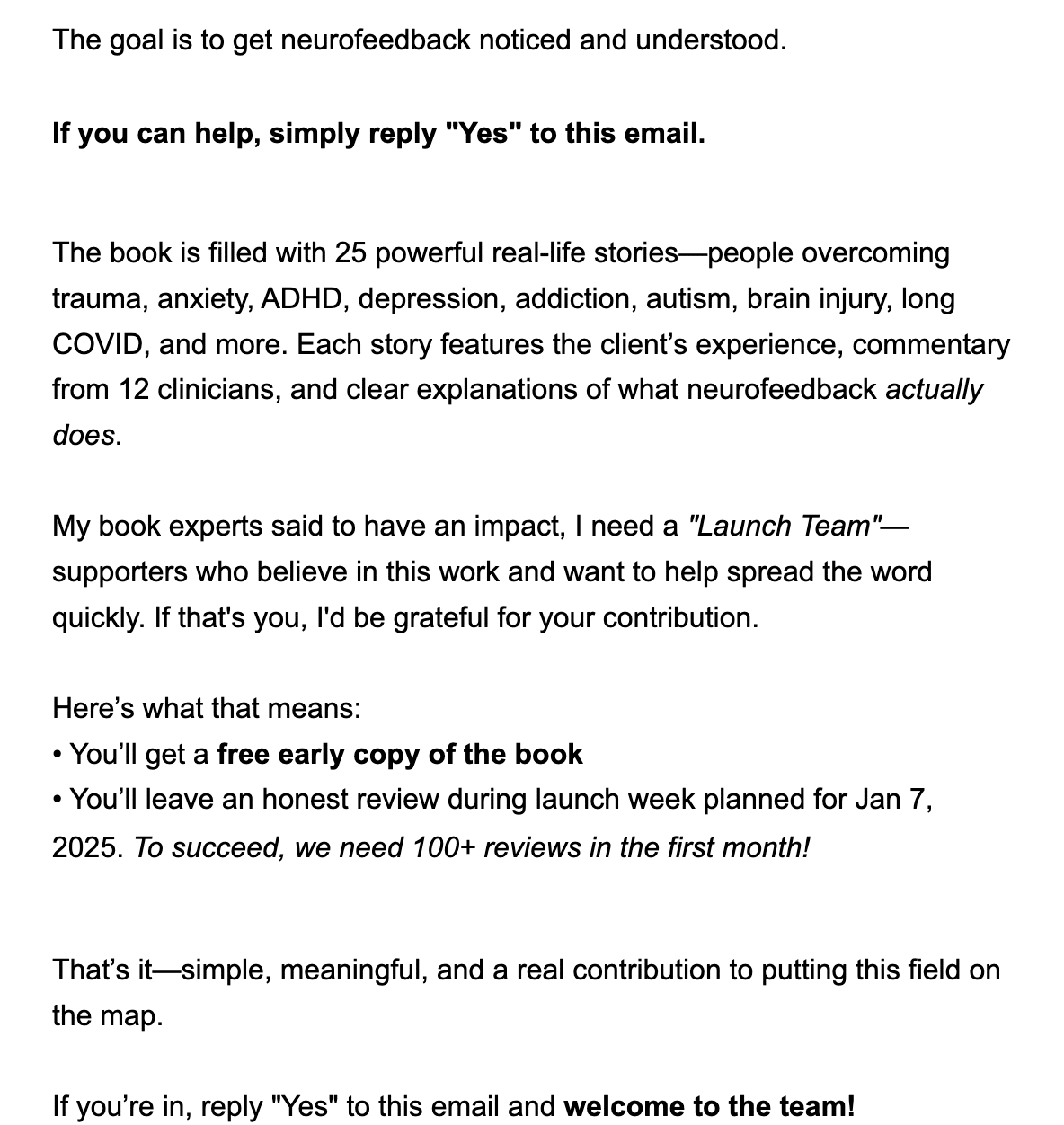 learning new windsurfing tricks from a former Olympian in the sport, Patti Kiley, here in San Diego 3 Secrets: 1. Using the crap out of your Amazon real estate Did you know you own real estate? well…on Amazon anyway. and most don’t use it the way they should YOU can engineer WHO shows up organically on your page at launch and YOU can use this to your advantage If you’re planning a strong launch, consider your Amazon book listing an arrow in your quiver Understand this: you can approach influencers and fellow authors in your space to partner with you to promote your book to their list, knowing that it’ll significantly positively influence their organic placement and sales on your listing. something like… I’m launching my next book on x-date and the listing goes live on y-date. Happy to send over a little blurb for you to send out to take as much work off you as possible. Your fan, soon to be big time author We’re currently working with Author Mike Cohen on his next book launch. His first book, Neurofeedback 101, has sold an impressive (for a first time author) 20,000 copies! each engagement is an opportunity for our team to not just teach, but also learn from the author. Last week, Mike taught me something I thought was genius: Make fun of your marketing team to get over the discomfort of asking for things!